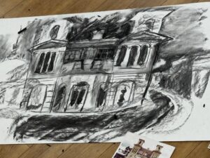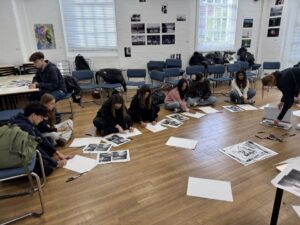 During the workshop, students had the chance to witness her process first hand. Barnes spoke passionately about her fascination with architecture and urban spaces, describing how her drawings grow from quick, gestural sketches into monumental compositions filled with vitality and texture. She encouraged students to embrace imperfection, to draw boldly and spontaneously, and to let the energy of observation guide their hand.